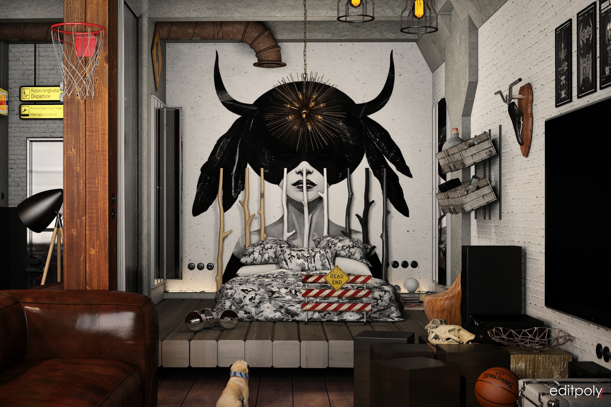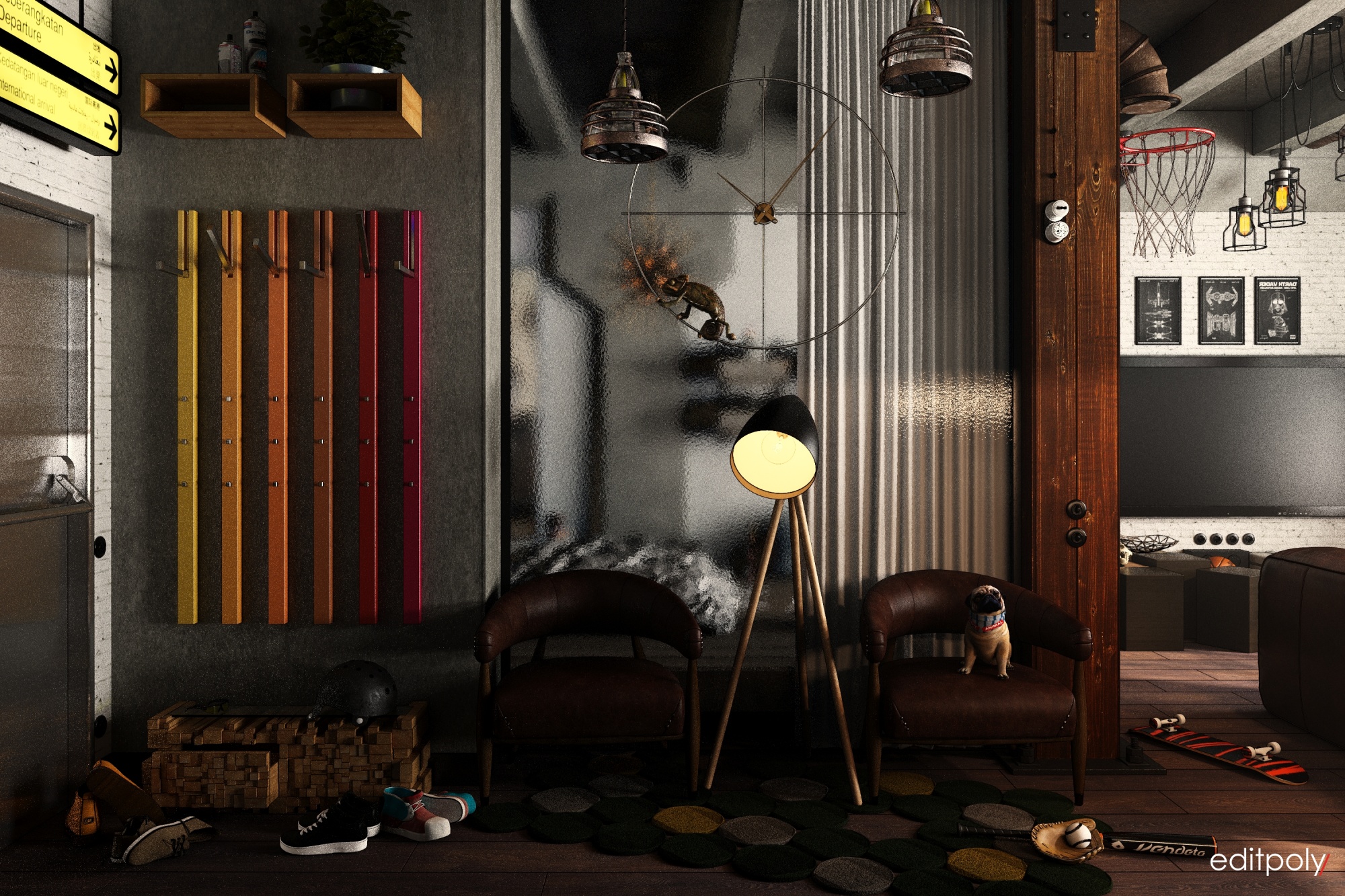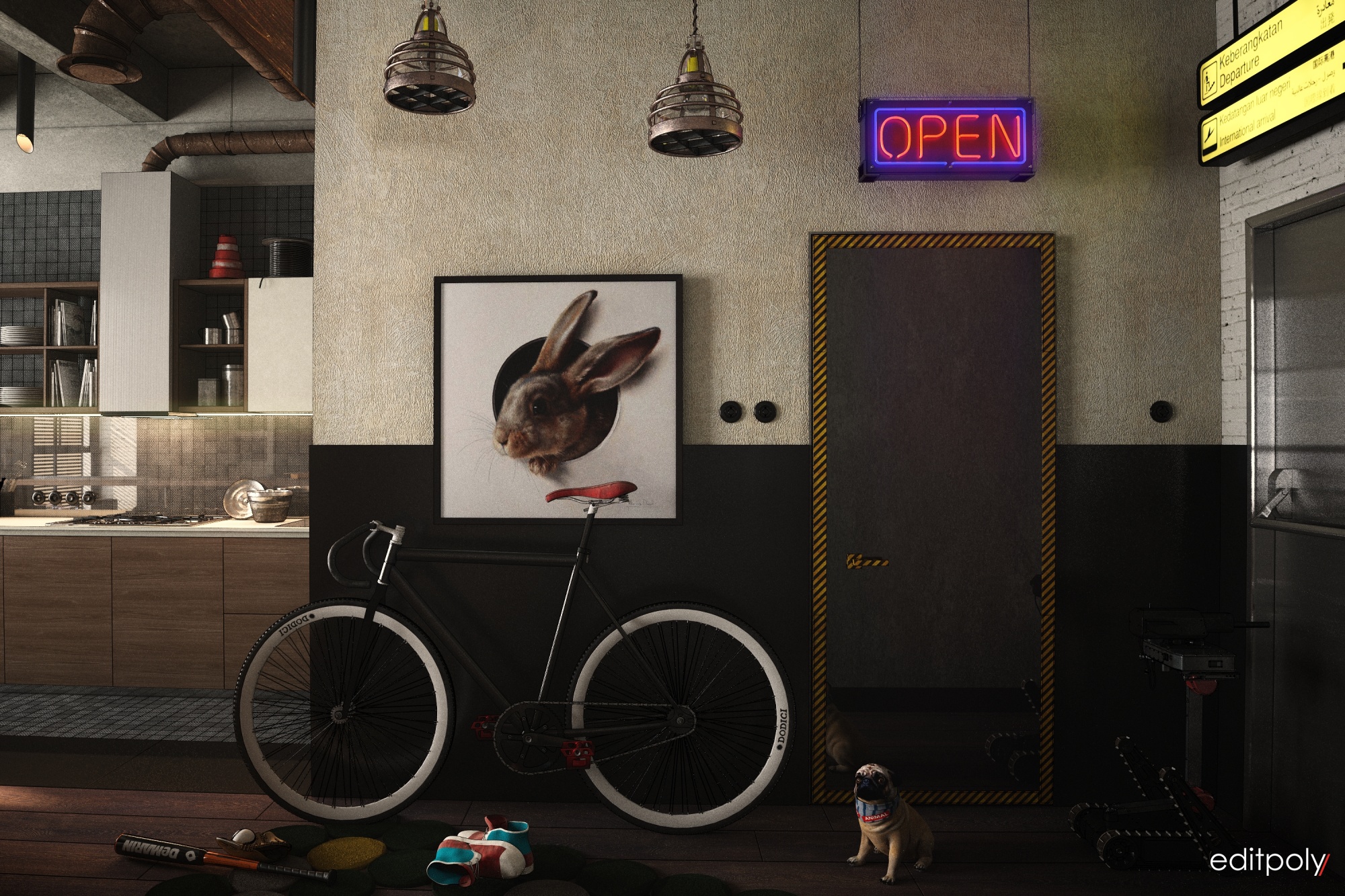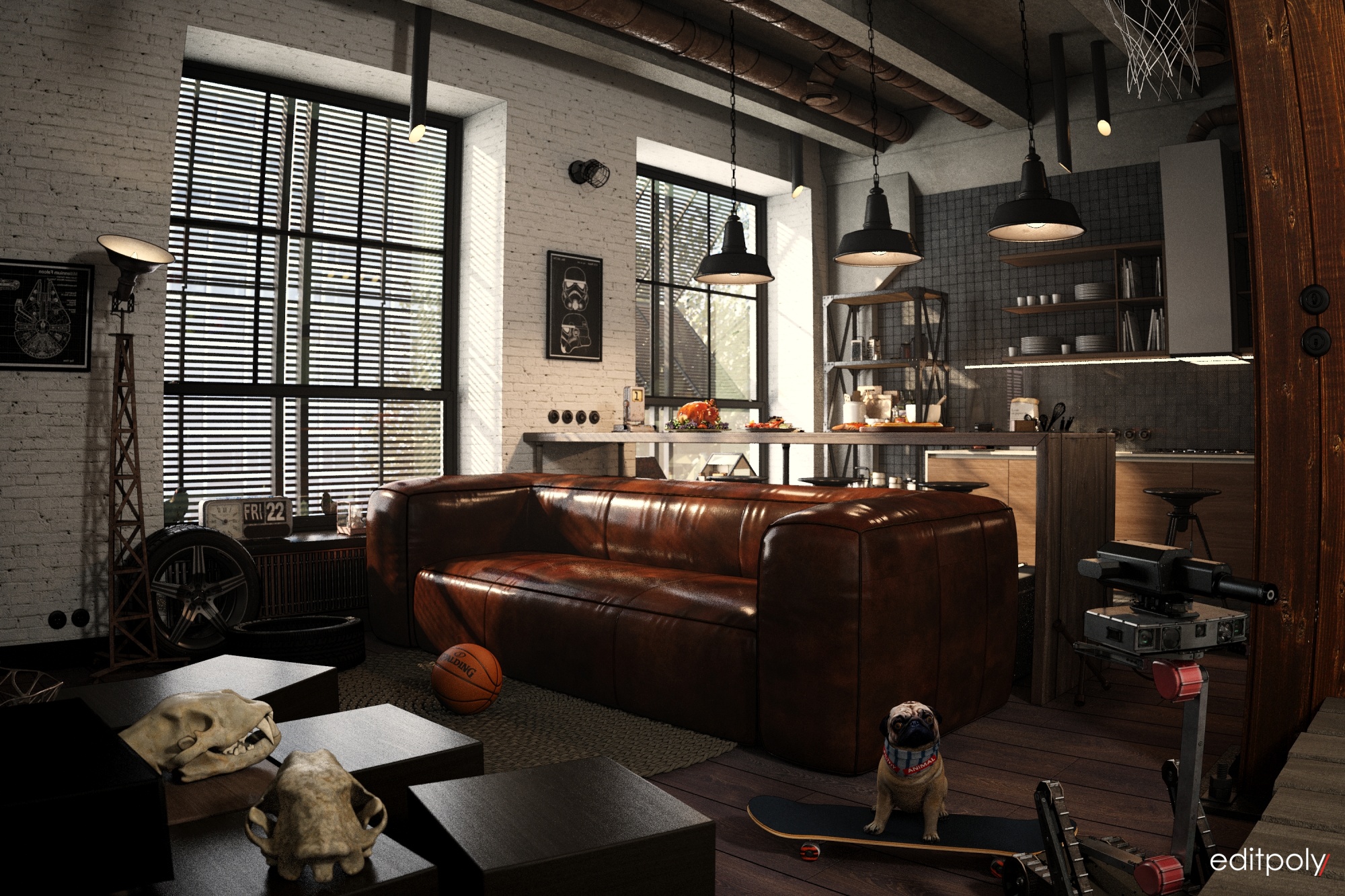 Разработка концепции, моделирование и 3d визуализация интерьера студийной квартиры в стиле лофт